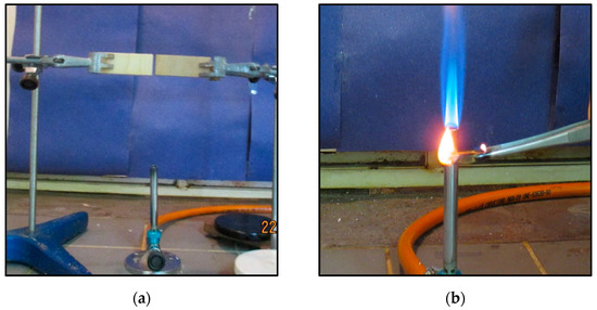 The flame retardant assay was set up using two laboratory stands with corresponding iron clamps where the mini-blocks were held at a height of 13.5 cm to meet the top of the Bunsen burner. Two pieces were tested at the same time in order to evaluate the differences between the control and a treated sample. Flames were burning for 1 min. Propagation was observed for 30 s, and then this process was repeated one more time. Lastly, 3 min of flame was applied and the wood pieces were weighed to determinate the mass loss (Figure 1a). Alternatively, a new assembly was proposed (Figure 1b). In this assembly, individual wood pieces were put into the Bunsen flame for 8 s and then the flame propagation time was recorded. This step was carried out three times. At the end, burned wood pieces were weighed and loss mass percentage was calculated.