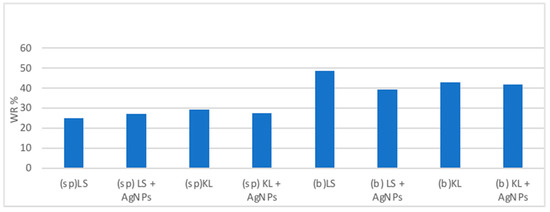 Weight retained percentage (WR%) after application of treatments, sp: Scots pine, b: beech, LS: Lignin sulfonate; KL: Kraft lignin, AgNPs: silver nanoparticles.