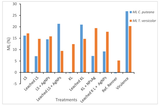LS and LS AgNPs treatments showed low efficacy against both fungi; the only positive result obtained with LS was with C. puteana and the leached samples. The presence of AgNPs was not useful for improving resistance against either fungi. The leaching procedure seemed to improve effectiveness, both against C. puteana and T. versicolor. In this case, it is difficult to find a scientific explanation. It is important to keep in mind that the objective of combining AgNPs with LS or KL is to limit the leaching of AgNPs (as was already demonstrated for other preservatives [24]); however, secondary, and undesirable, effects could be produced. These effects may influence the AgNPs availability to the fungus and, therefore, limit their performance in durability improvement. When LS or KL is added, together with laccase, and applied to wood, LS and KL may produce larger polymers by copolymerization. This means they can graft onto the wood surface, producing, at the end, a complex matrix on the wood surface. When this process happens in the presence of AgNPs, this matrix can include nanoparticles. The interaction of nanoparticles with KL or LS, which depends on the structure and functionality of LS and KL, as well as the operational conditions of the treatment (enzyme dose, pH, treatment time, temperature, etc.) may affect the level of fixation of AgNPs into the matrix. Such interactions are very important to elucidate the real effects of nanoparticles in combination with LS and KL, although they are not the objective of this work. Depending on the level of fixation, the AgNPs could be ready to act against fungi or they could be completely entrapped and not readily available, at least for some time. In the latter case, a leaching process could improve the availability of AgNPs and, therefore, improve durability, in comparison to non-leached samples. However, this effect is not as important for real-world application, since the effect of nanoparticles is expected to be produced in the same way and observed sometime after fungal colonization. In the case of KL and AgNPs, the improvement in AgNPs was observed without leaching, which denotes that that LS and KL form different matrices that can act differently against fungi.