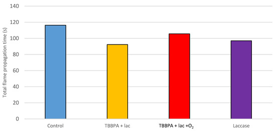 Total time of flame propagation along the 3 flame exposition times. Control: water impregnated only; TBBPA: treated with TBBPA alone; TBBPA/Laccase: treated with TBBPA and laccase; TBBPA/Laccase/O2: treated with Laccase and O2; Laccase: treated with laccase alone.