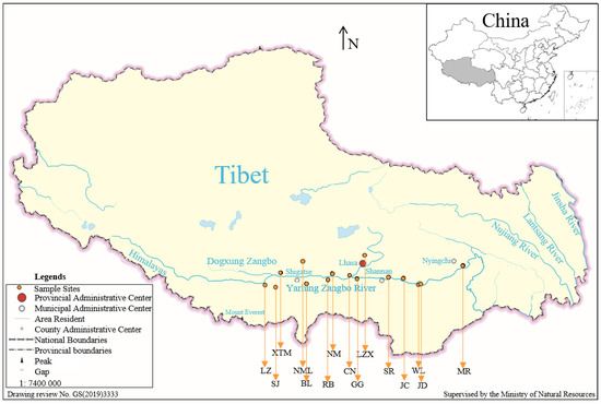 Fifteen sampling population sites of S. moorcroftiana in Qinghai–Tibet Plateau for genetic diversity analysis. All abbreviations in Figure 1 are defined as follows: Sajia County (SJ), Linzhou County (LZ), Xietongmeng County (XTM), Nanmulin County (NML), Bailang County (BL), Renbu County (RB), Nimu County (NM), Caina County (CN), Gongga County (GG), Lazi County (LZX), Sangri County (SR), Jiacha County (JC), Wolong County (WL), Jindong County (JD), and Mirui County (MR).