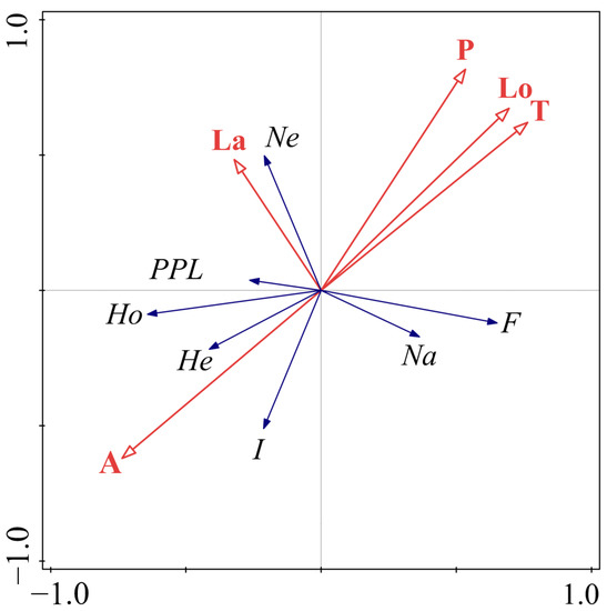 Redundancy analysis (RDA) of genetic diversity parameters and environmental factors for S. moorcroftiana. All abbreviations in the Figure 2 are defined as follows: altitude (A), latitude (La), precipitation (P), longitude (Lo), temperature (T), average number of alleles (Na), effective number of alleles (Ne) Shannon’s diversity index (I), observed heterozygosity (Ho), expected heterozygosity (He), percentage of polymorphic loci (PPL), and fixed index (F).
