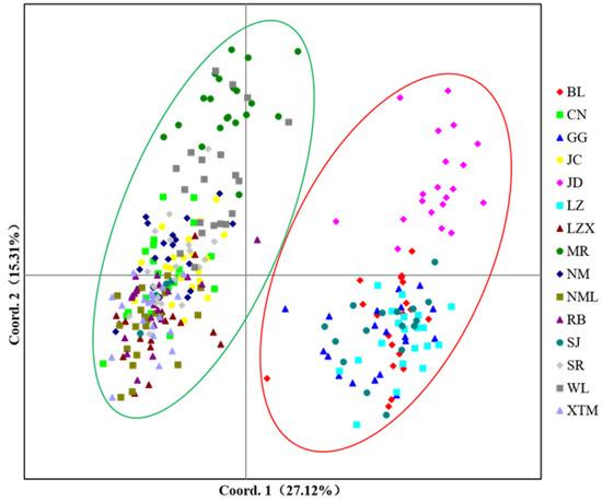 PCoA results showed that the first, second, and third principal components accounted for 27.12%, 15.31%, and 9.32% of the total variation, respectively. The first and second principal components are shown in the PCoA chart (Figure 3). According to the principal components based on the K-means [21], the left and right sides of the first principal component were clustered into one category, and the upper and lower right sides were clustered into two categories. A close chart indicated high genetic similarity. In addition, the genetic similarity among populations was high, and genetic difference among groups was obvious.
