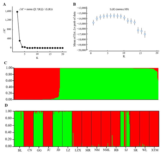 Bayesian-model-based clustering STRUCTURE analysis of 300 individuals of S. moorcroftiana. (A) △K values for different numbers of clusters (K); (B) mean log-likelihood (Ln(K) ± SD) against the number of K; (C,D) estimated population structure of 300 S. moorcroftiana individuals on K = 2; (C) bar plot sorted by Q-value in a single line; (D) bar plot grouped by population ID in multiple lines.