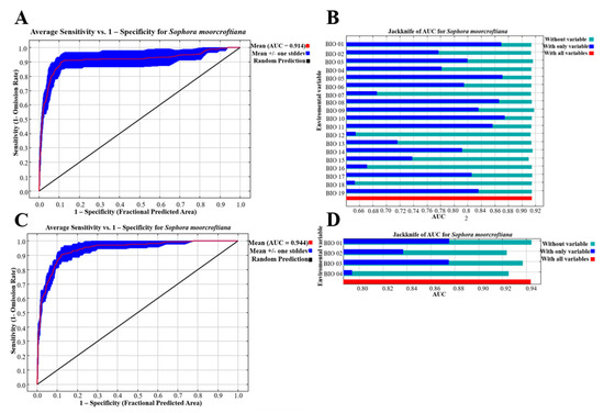 (A) ROC curve of MaxEnt model simulation results of all climate variables; (B) ROC curve of MaxEnt model simulation results of the selected climate variables; (C) Jackknife test for evaluating the relative importance of all climate variables on the distribution of S. moorcroftiana; (D) Jackknife test for evaluating the relative importance of the selected climate variables on the distribution of S. moorcroftiana.