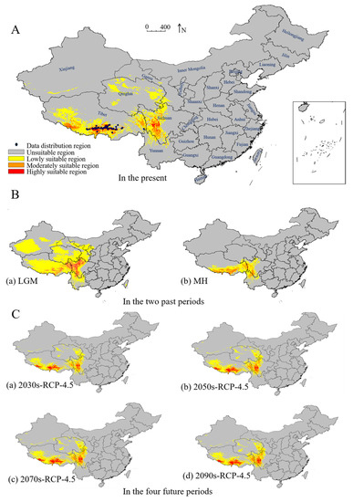 Suitable distribution area of S. moorcroftiana in China. (A) Suitable regional distribution and 60 data point distributions of S. moorcroftiana in the present period; (B,C) suitable regional distribution of S. moorcroftiana in the past two periods and four future periods by the RCP 4.5 pathway.