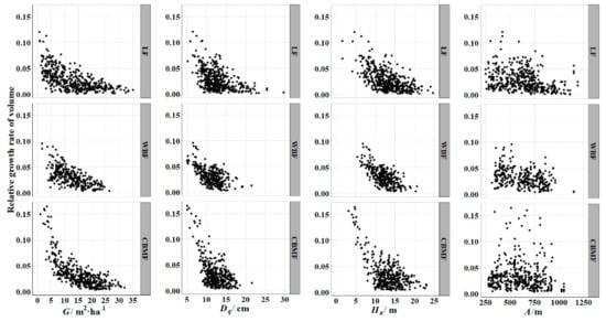 and  are the models’ parameters and X is the independent variable vector. Seven variables were used in the model: (1) altitude (); (2) dominant species mean diameter (); (3) quadratic mean diameter of dominant species (); (4) stand basal area (); (5) average tree height (); (6) the number of trees per hectare (); and (7) slope of the plot (). All models with insignificant variables (p-value > 0.05) were eliminated. The relationship between variables and growth rate are provided in Figure 2. The model fitting performance was evaluated by three evaluation statistics: adjusted coefficient of determination (), root mean square error (), and Akaike information criterion (). The equation with the largest  and the smallest  and  was chosen as the best basic model.
