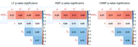 The heteroscedasticity is commonly found in growth models. It is well known that the error variance of the  observation is functionally related to one or more predictors, which can be modeled with a power function, such as ) []. The power coefficient k can be obtained by iteratively using the residual variance model ), in which  is the model residual of the unweighted basic model. In this study, we chose  as the weight function. The Breusch–Pagan test was used to measure the heteroscedasticity corrected model. It uses a variance function and a -test to test the null hypothesis that heteroscedasticity is not present (i.e., homoscedastic) against the alternative hypothesis that heteroscedasticity is present []. To ensure that there is no “multicollinearity” in the model, a correlation test method was used.