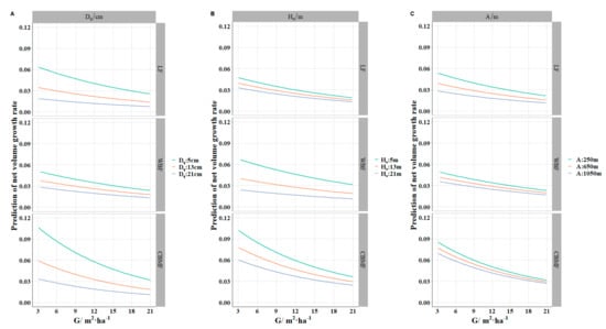 For , the  across three levels of  differed more than  and . This result indicated that the effect of the individual’s radial size on the growth rate was higher than that of the longitudinal size and site in LF. The opposite result was found in , where the  differences among the average  values were greater than other variables. For , the differences among both  and  were greater than . The  rank among the three stand types varied across diameter levels (Figure 5A), when the  were 5 and 13 cm, the  was ranked as  >  > . The order changed when  was 21 cm:  >  > . For both  and ,  consistently had the highest  across all the three levels.
