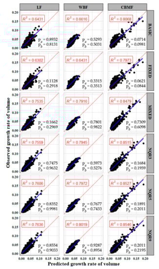 The parameter estimations of the mixed-effects models are presented in the Appendix A (Table A4, Table A5 and Table A6). Different random parameter combinations were sequentially added to the basic model. The best mixed-effects models for the three forest types were finally determined after considering the model convergence and the comparison of fitting indicators. The model forms for LF, WBF and CBMF are as follows (– are random parameters):