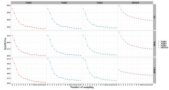 For the mixed-effects models, the result of sampling indicated that when the sample size was more than six (Appendix A: Table A7), the following occurred: (1)  decreased by about 9.9%, 25.1%, and 2.1% for LF, WBF, and CBMF, respectively; (2)  decreased by about 15.6%, 17.3%, and 6.3% for LF, WBF, and CBMF, respectively; (3)  decreased by about 14.2%, 15.6%, and 4.8% for LF, WBF, and CBMF, respectively. The results were varied across the three forest types for the three quantile regression models, in which: (1) the  of the ,, and  decreased by about 24.7%, 25.3%, and 25.6% for ; 26.2%, 26.3%, and 26.5% for ; and 24.2%, 24.7%, and 24.8% for , respectively; (2) the  of the ,, and  decreased by about 27.5%, 28.0%, and 30.0% for ; 10.2%, 13.1%, and 15.3% for ; and 34.9%, 37.5%, and 40.2% for , respectively; (3) the  of the ,, and  decreased by about 21.2%, 21.3%, and 21.3% for ; 20.4%, 20.8%, and 20.9% for ; and 21.0%, 21.2%, and 22.4% for .