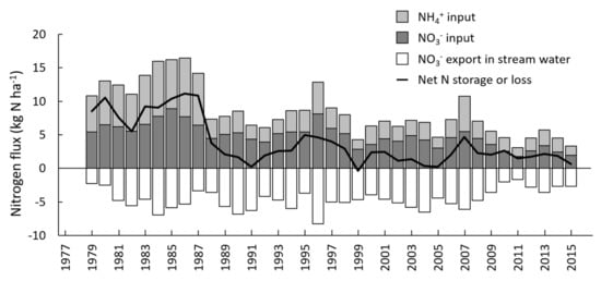 The northeastern United States experienced relatively high atmospheric N deposition during the latter half of the 20th century [,], increasing N supply into some forested ecosystems enough that the availability of N exceeded stand N demand—a situation that can cause significant nitrate (NO3−) leaching []. Substantial loss of NO3− contributes to an associated leaching of base cations, such as calcium and magnesium, which are important to plant growth [,,], and may also have negative effects downstream []. Since the passage and subsequent amendment of the Clean Air Act, national emissions of NOx and atmospheric N deposition have steadily declined; however, the response of forested catchments is variable. Some have lower N export following national emission and deposition trends, while the levels of N export in others remain high and result in declining inorganic N retention [,,]. Given the ecological implications of N export into stream water, it is important to understand what controls watershed responses to changes in N deposition through time.