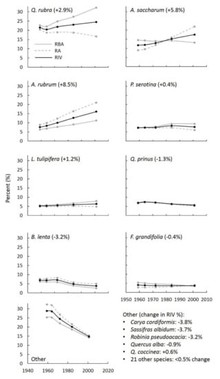 Tree species’ relative importance, abundance, and basal area (%) in FEF WS 4 from 1959 to 2001. The percent changes for species listed under “other” are changes in RIV. Data from the USDA Forest Service Northern Research Station [].