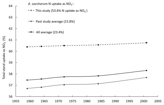 Prior studies, using other methods and some using more sampling dates, found much lower rates of N uptake as NO3− by A. saccharum (average of 15.8%, vs. 53.6% in this study) (Table 2). Given the range of values reported for the affinity of A. saccharum for NO3−, we assessed the potential impact that changes in this particular species might have on stand uptake of NO3− by considering two scenarios. First, we used the average relative contribution of NO3− to tree uptake of N (15.8%) reported in previous studies. Second, we used the average of all available estimates of NO3− uptake by A. saccharum, which raised the average to 23.4%. In both scenarios, to estimate stand uptake of NO3− we used the average of our measured values of NO3− uptake for all unmeasured species. For the first scenario, when values from previous studies were applied to the estimates of total N uptake within WS 4 at the FEF, NO3− uptake increased from 17.5 to 20.3 kg N ha−1 yr−1 (2.8%) and NH4+ uptake increased from 13.4 to 14.9 kg N ha−1 yr−1 (1.5%) from 1959 to 2001. Under this scenario, the percent of total stand uptake of N as NO3− increased slightly, from 56.7% to 57.7% (Figure 3). For the second scenario, using all available estimates of NO3− uptake, the stand uptake of NO3− increased from 17.6 to 20.5 kg N ha−1 yr−1 (2.6%) and uptake of NH4+ increased from 13.1 to 14.7 kg N ha−1 yr−1 (1.5%) from 1959 to 2001. In addition, the percent of total stand uptake of N as NO3− increased slightly 57.4% to 58.3% (Figure 3). Thus, in neither of the two scenarios did the observed change in the importance of A. saccharum reduce the absolute amount NO3− uptake, and in only one scenario was the relative amount of NO3− uptake reduced—but this apparent reduction was extremely small.