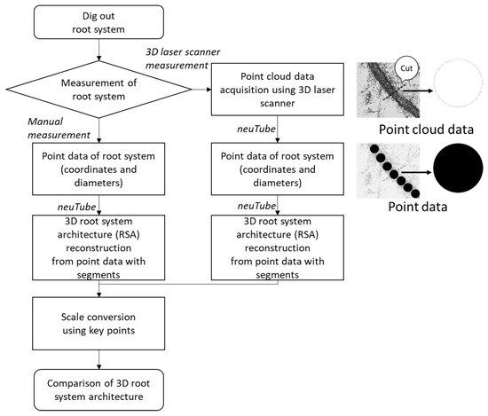 On the other hand, automatic methods that can obtain data on RSA rapidly collect data as a point cloud that consists of a very large number of points representing the root surfaces. Lontoc-Roy et al. [21] used computed tomography to obtain point cloud data of the root systems of tree seedlings, but this method cannot be used on large trees in the field. Additionally, the method did not convert point cloud data to root axes and segments. An automatic method that can be applied to large trees uses three-dimensional (3D) laser scanners. Although 3D laser scanners are expensive, they can collect point cloud data from 3D surfaces with high accuracy without contact, and thus, are used for measuring the aboveground parts of trees [22,23,24,25,26]. Lau et al. [27] reported the accuracy of the traits of branches > 10 cm in diameter reconstructed from the 3D quantitative structure models (QSM) from point cloud data using a 3D laser scanner in 4, up to 30 m high, tropical tree species with the leaves, scanned from the ground. However, only large branches (>40 cm in diameter) could be accurately reconstructed compared to manual measurements. Gärtner et al. [28] used 3D laser scanning to acquire point cloud data of the entire root system of 80-year-old Picea abies (L.) Karst. trees. Wagner et al. [29,30] created annual growth models at the root segments from 3D laser scans of the root system and 2D annual tree-ring data of 12-year-old Pinus sylvestris L.. The mean absolute percentage error per volume of two root segments with diameters of 1.6 cm and 1.8 cm was reported to be 6.0% on average. Smith et al. [31] measured the volumes of 13 root systems of P. abies trees with a 19–47 cm stump diameter by converting point cloud data into polygon data using computer-aided design software. Only a few studies have used 3D laser scanning to evaluate root systems [12]. The 3D QSM reconstruction method has been used for both above- and below-ground of trees, but it requires specific parameters to fit the model, which could vary the accuracy of reconstruction [27,31]. Although only a theoretical comparison between semi-automatic methods and 3D laser scanning was reported in Danjon and Reubens [12], the accuracy of root point data reconstructed from 3D laser scan measurement has never been checked [31]. Moreover, 3D laser scanning has yet to be fully used for measuring the root system traits such as diameter and CSA from point cloud data. Although it is the best available technique to describe the shapes of root surfaces, intensive intervention is still required for calculating root system traits [12]. Therefore, an automated step is needed to convert the point cloud data of the root surface measured by a 3D laser scanner to the root point data.