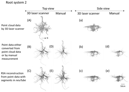 The manual data RSAs (Figure 3D,E,d,e and Figure 4D,E,d,e) were reconstructed to a similar extent as in the 3D laser scanner RSAs (Figure 3B,C,b,c and Figure 4B,C,b,c) based on visual comparison. Similarly, the main root segments were well reproduced. However, the manual data RSAs were simpler and sparser than the surface-shaped 3D laser scanner RSAs (Figure 3A,a and Figure 4A,a).
