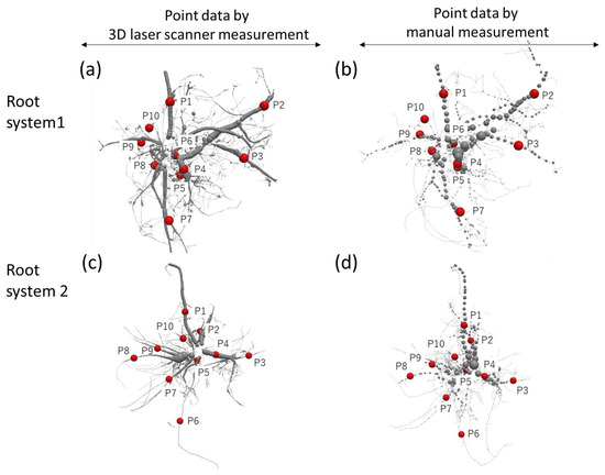 Positions of 10 points (P1–P10) set to evaluate the accuracy of the xyz coordinates and root diameters in root point data collected in (a,b) Root system 1 and (c,d) Root system 2 by (a,c) 3D laser scanner and (b,d) hand.