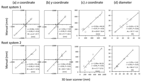 Relationships of (a) x, (b) y, (c) z coordinates, and (d) diameter of 10 selected root points between 3D laser scanner and manual measurements. The correlation coefficient (r) was calculated as the mean value estimated by 1000 bootstraps. The differences (Di, mean ± standard error) in distances from each coordinate obtained by the manual measurement to that of the 3D laser scanner were calculated at the 10 root points in each root system. The accuracy (Ac, mean ± standard error) of root diameter at 10 root points in each root system was defined as the percentage of the diameter estimated by the 3D laser scanner to that of the manual measurement according to Lau et al. [27].