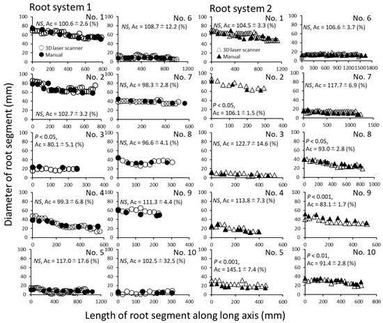 Changes in the diameters of 10 root segments along the long axis in each root system by 3D laser scanner and manual measurements. A paired t-test was used to compare the differences in the diameters of 10 root segments along the long axis data obtained by the manual measurement with those obtained by the 3D laser scanner. NS: not significant (p > 0.05). The correlation coefficient (r) was calculated as the mean value estimated by 1000 bootstraps. The accuracy (Ac, mean ± standard error) of the diameter at 10 root segments in each root system was defined as the percentage of the diameter estimated by the 3D laser scanner to that of the manual measurement according to Lau et al. [27].