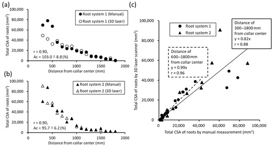 The total CSAs tended to decrease with distance from the collar center in both methods (Figure 9a,b), notably so in root system 1 at <500 mm. The correlations of the total CSAs between the measurements were consistently high in each root system (root system 1, r = 0.90; root system 2, r = 0.93; Figure 9a,b). The accuracy (Ac) of CSA was 103.0% in root system 1 and 95.7% in root system 2. There was a positive correlation between the methods, with a slope of 0.82 (r = 0.88), as seen in Figure 9c. This indicated that the total CSAs estimated by the 3D laser scanner were smaller than those estimated from manual measurements.