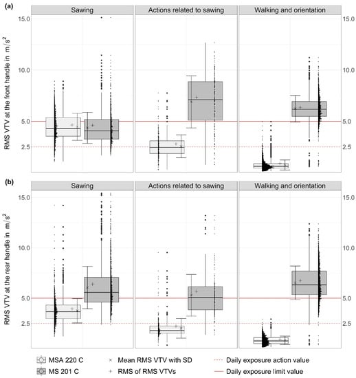 RMS VTVs of both chainsaws separated by the type of activity (a) for the front handle (b) for the rear handle.