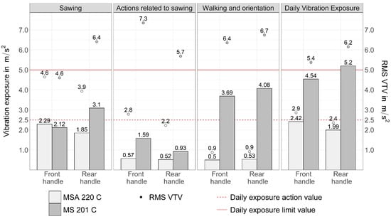 Comparing the vibration total values of the work elements with the exposure action and limit values for the daily vibration exposure, the MS 201 C exceeds the limit value at the rear handle for each work element. At the front handle, only the RMS VTV for sawing is beneath the limit value, but the difference is only about 8%. The situation changes when working with the MSA 220 C. Its RMS VTVs are below the limit value for each work element and both handles. For work element three, the values are not even close to the action value. Yet, during sawing, the vibration total values by far exceed the action value and approach the limit value, falling short of it by 7.8% at the front, and by 26.9% at the rear handle. For the second work element, the values are very close to the action value, exceeding it by about 11% at the front handle and falling below it by about 11% at the rear handle.