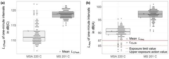 A more thorough representation is given in Figure 4. It displays a box plot combined with a dot plot of the peak sound pressure levels and of the equivalent continuous sound pressure levels of the measuring intervals for both chainsaws. Especially noticeable is the relatively large distance in mean and median for the MSA 220 C, which is caused by several outliers, whose sound pressure level is considerably higher than the ones of the other values. Looking at the , there are nearly no outliers at the top, but several at the bottom. Nevertheless, nearly all the measured values exceed the upper exposure action value, and most often even exceed the exposure limit value.