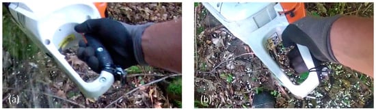 For the vibration measurements the accelerometer was mounted on Brüel & Kjaer’s cube adapter UA-3017 [31], which in turn was clamped to the handle of the chainsaw by cable ties as is proposed by [29]. On the front handle the sensor had to be placed at the outermost part of the horizontal crossbar to avoid interference with the workflow of the operator (Figure 1). The position is very close to the one prescribed by [34] (“Forestry and gardening machinery—Vibration test code for portable hand-held machines with internal combustion engine—Vibration at the handles”) and [35] (“Hand-held motor-operated electric tools—Safety—Part 2–13: Particular requirements for chain saws”), but is a few centimeters off to the right. Because of ergonomic and safety reasons, the accelerometer could not be positioned in compliance with the two norms at the rear handle. Instead of the position right above the user’s hand, a position proposed by [29], right underneath the user’s hand, was chosen to measure the vibrations as close to the user’s hand as possible (Figure 1). Since just one accelerometer was available, only the vibrations on one of the handles could be measured at a time and the sensor had to be mounted anew before each cycle.