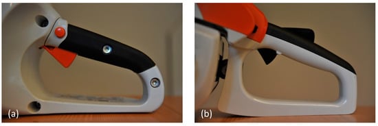 At the rear handle, the vibrations that were measured on the MS 201 C are significantly higher than the ones of the MSA 220 C. The difference cannot be explained by the differences in performance. Instead, it seems to be caused by the ergonomics of the rear handles. On the MS 201 C, the operator very frequently loosened his grip on the rear handle, while sawing (Figure 5). In comparison, the grip on the MSA 220 C was way tighter (Figure 5) and never loosened in the same way. This is due to the positioning of the trigger lock (equivalent to the throttle lock of the combustion-driven chainsaw). The throttle lock of the MS 201 C is on top of the rear handle (Figure 6) and is automatically unlocked when putting the hand on the handle. The throttle can then be pressed by using the thumb, while the other four fingers can loosen their grip. On the MSA 220 C, however, the trigger lock must be pressed with the thumb, since it is positioned on the left side at the front of the handle (Figure 6). Hence, the throttle is activated with the index finger, preventing the operator from loosening his grip, which, in turn, leads to a slight bending of the wrist (Figure 5). Holding this kind of position permanently during sawing, means an intensive ergonomic stress in a pre-commercial thinning, which requires frequent tilting movements of the chainsaw.