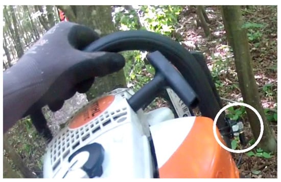 - Saw held on one handle: All periods when, due to the experimental set-up, the chainsaw was held on only one handle. These periods mainly included actions, such as, for example, pushing down sawn-off trees or laying them aside.
