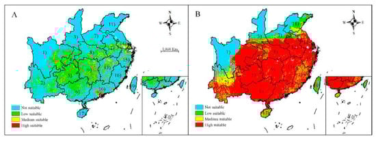 Distribution of potentially suitable habitat for Cinnamomum camphora predicted by (A) Maxent and (B) GARP. Both Maxent and GARP used the same threshold of classification, i.e., ‘high potential’ (>0.6), ‘moderate potential’ (0.4–0.6), ‘low potential’ (0.2–0.4), and ‘not potential’ (<0.2) habitat. Maps show only the provinces where C. camphora was predicted to occur.