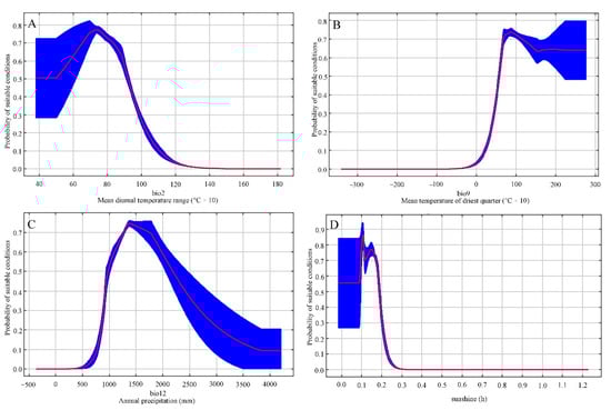 Environmental variables which had maximum contributions to the construction of the C. camphora distribution model using the Maxent method were mean diurnal temperature range (40.9% contribution), annual precipitation (Bio 12, 23.0% contribution), mean air temperature of the driest quarter (Bio 9, 10.5% contribution), and sunshine duration in the growing season (SDGH, 7.2% contribution). The cumulative contribution of the above-mentioned four environmental parameters was 81.6%, showing their significant contribution to the distribution of C. camphora. In accordance with such standard curves concerning the C. camphora distribution model (Figure 2), the leading parameter thresholds were obtained (at an occurrence probability >0.3), Bio 2 of 4–10, Bio 9 of 4–20 °C, Bio 12 of 900–2500 mm, and SDGH of 100–200 h included.