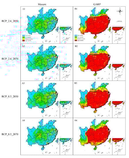 In the RCP 8.5 climate scenario, Maxent and GARP forecast that areas with changes were in the same provinces as those in the RCP 2.6 climate scenario (Figure 3 and Figure 4) and the distribution shift was very similar. Maxent forecast that areas of increased suitability reached ca. 1.79 × 105 km2 and 1.46 × 105 km2 in RCP 8.5-2050 and -2070 climate scenarios, respectively, and GARP forecast increased areas reached 1.12 × 105 km2 and 1.08 × 105 km2 in RCP8.5-2050 and -2070 climate scenarios, respectively. Maxent forecast reduced areas reached ca. 0.73 × 105 km2 and 1.93 × 105 km2 in RCP 8.5-2050 and -2070 climate scenarios, respectively, and GARP forecast reduced areas reached 1.78 × 105 km2 and 3.06 × 105 km2 in RCP8.5-2050 and -2070 climate scenarios, respectively.