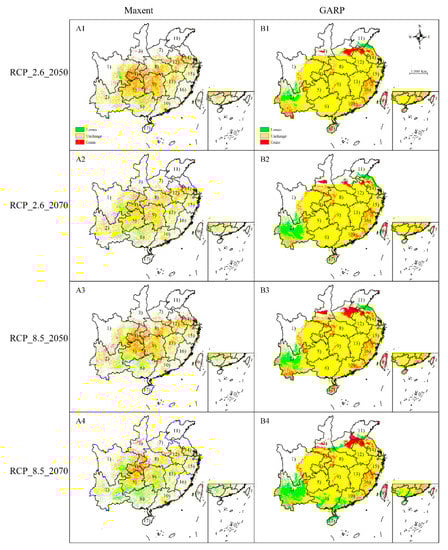 Comparison between current potential habitat and habitat under climate change scenarios RCP2.6 and RCP8.5 by Maxent (A1–A4) and GARP (B1–B4). A1, B1: scenarios for RCP 2.6–2050; A2, B2: scenarios for RCP 2.6–2070; A3, B3: scenarios for RCP 8.5–2050; A4, B4: scenarios for RCP 8.5–2070. White areas indicate unsuitable habitats; yellow, red, and green area indicate unchanged, increased, and decreased suitable habitat, respectively, compared with the current potentially suitable habitat. (1), Sichuan; (2), Yunnan; (3), Shanxi; (4), Chongqing; (5), Guizhou; (6), Guangxi; (7), Henan; (8), Hubei; (9), Hunan; (10), Guangdong; (11), Shandong; (12), Anhui; (13), Jiangxi; (14), Jiangsu; (15), Zhejiang; (16), Fujian; (17), Hainan; (18), Taiwan. Only the provinces where C. camphora was predicted to occur are shown.