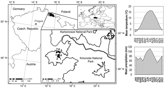 - Podrázský, V.; Vacek, S.; Vacek, Z.; Raj, A.; Mikeska, M.; Boček, M.; Schwarz, O.; Hošek, J.; Šach, F.; Černohous, V.; et al. Půdy Lesů a Ekosystémů nad Horní Hranicí Lesa v Národních Parcích Krkonoš; Kostelec nad Černými lesy, Lesnická práce, s. r. o.: Kostelec nad Černými lesy, Czech Republic, 2010. [Google Scholar]