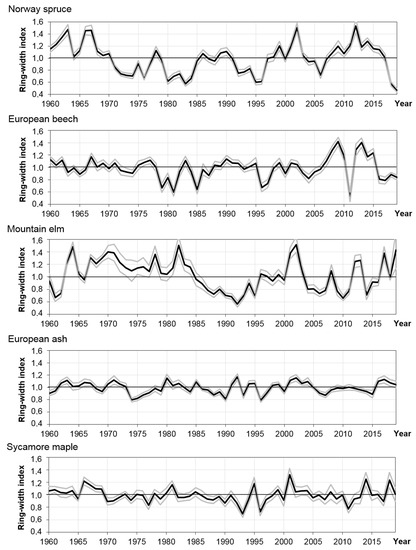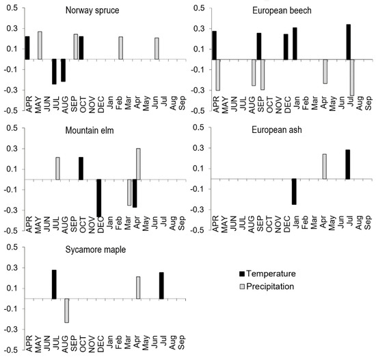 - Kolář, T.; Čermák, P.; Trnka, M.; Žid, T.; Rybníček, M. Temporal changes in the climate sensitivity of Norway spruce and European beech along an elevation gradient in Central Europe. Agric. For. Meteorol. 2017, 239, 24–33. [Google Scholar] [CrossRef]