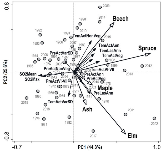 - Mikulenka, P.; Prokůpková, A.; Vacek, Z.; Vacek, S.; Bulušek, D.; Simon, J.; Šimůnek, V.; Hájek, V. Effect of climate and air pollution on radial growth of mixed forests: Abies alba Mill. vs. Picea abies (L.) Karst. Cent. Eur. For. J. 2020, 66, 23–36. [Google Scholar] [CrossRef]