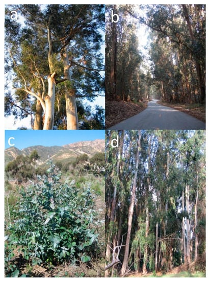 - Fork, S.; Woolfolk, A.; Akhavan, A.; Van Dyke, E.; Murphy, S.; Candiloro, B.; Newberry, T.; Schreibman, S.; Salisbury, J.; Wasson, K. Biodiversity effects and rates of spread of nonnative eucalypt woodlands in central California. Ecol. Appl. 2015, 25, 2306–2319. [Google Scholar] [CrossRef] [PubMed]