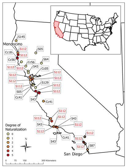 Collection locations, degree of naturalization and distribution of cpDNA JLA+ haplotypes in adult samples of Eucalyptus globulus from California (see Table S1 for further details). The JLA+ haplotypes have been grouped into Central (Cc) and Southern (S) types, and codes follow Table A1 and Table S1. The distribution of the S112 haplotype, which has only been found in ornamental plantings of E. globulus in Australia, is indicated in red. Only locations used in the naturalization study with JLA+ haplotypes available are plotted (detailed in Table S1).