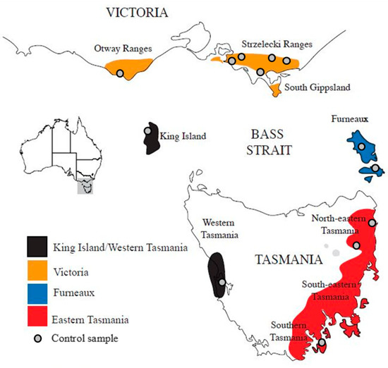 Map of southeastern Australia showing the approximate native range of Eucalyptus globulus (shaded in grey in insert map of Australia). The four geographic regions (Victoria, Furneaux, King Island/western Tasmania and eastern Tasmania) into which the 590 native samples with nuclear microsatellite data were allocated for the STRUCTURE analysis are shown. The specific locations of the 13 control samples used to align the microsatellite scores of the Californian landrace samples with the native range are shown. The map is modified from Jordan et al. [67].