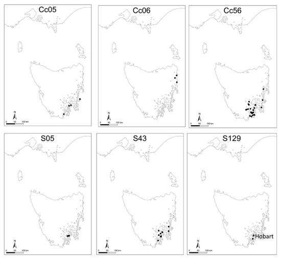 Native Australian distribution of six chloroplast haplotypes found in the Californian landrace of E. globulus of the central (Cc05, Cc06 and Cc56) and southern (S05, S43 and S129) types. These haplotypes are six of the nine haplotypes which have been found in native samples of E. globulus from Australia and have a localized distribution within eastern Tasmania. The location of Hobart is shown (*) on the S129 map.