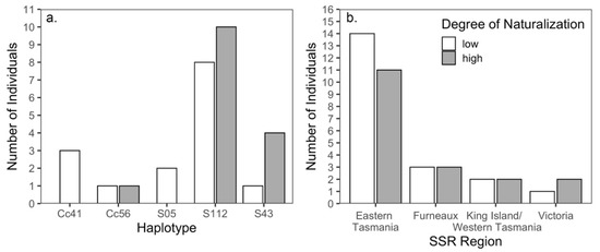 There was a complete continuum in degree of naturalization among the 39 sites assessed in California (Figure S1), with 18 having naturalization scores of three or greater (abundant or extensive naturalization, >20 saplings per 400 m2) and these were widely distributed in coastal areas (Figure 2, Table S1). In contrast, we observed 21 sites with low naturalization (score of two or lower). We observed groves with no evidence of naturalization and groves with varying degrees of naturalization in close proximity. Across the 39 sites, we found a total of 12 cpDNA haplotypes in adults. Seven of these were represented only once in the sites assessed so were removed from the ANOVA regarding naturalization (removed haplotypes: Cc05, Cc06, Cc18, S129, S145, S64, and S87). Included in these analyses were the five remaining cpDNA haplotypes found in 30 adult individual trees (S112, n = 18; S43, n = 5; Cc41, n = 3; S05, n = 2; Cc56, n = 2) from 29 unique sites (sites with only juveniles and sites with unique haplotypes were removed). We found no effect of cpDNA haplotype on naturalization (ANOVA, p = 0.42, F4, 25 = 1.01). The most prevalent cpDNA haplotype (S112) was found in groves exhibiting all levels of naturalization, including zero naturalization (Figure 5 and Figure S1). For the SSR assignment, there were four assigned regions represented in 38 adult trees sampled at 36 unique sites: eastern Tasmania, n = 25; Furneaux, n = 6; western Tasmania, n = 4; and Victoria, n = 3. We found no effect of the SSR-assigned region on naturalization (ANOVA, p = 0.658, F3,34 = 0.54). We also grouped sites into low naturalization (scores 0–2) and high naturalization (scores 3–5) (Figure 5). We found that no cpDNA haplotype (Fisher’s exact test p = 0.1392) (Figure 5a) nor any SSR-assigned region (Fisher’s exact test p = 0.9442) (Figure 5b) was more likely to show high naturalization.