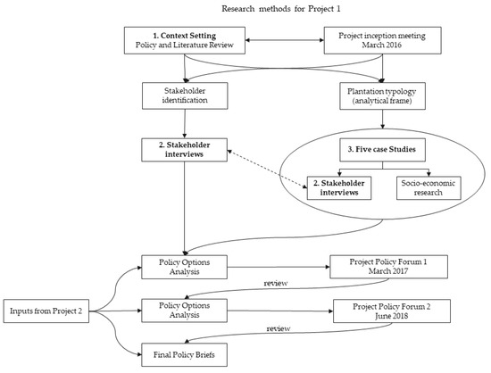 The data and information utilized in this study were primarily collected through research activities undertaken as part of a project “Improving policies for forest plantations to balance smallholder, industry and environmental needs in Lao PDR and Vietnam” (Project 1). The research design and methods used in that project are described here (Figure 1). Results were supplemented by research undertaken in a second project “Advancing enhanced wood manufacturing industries in Laos and Australia” (Project 2) in which two authors also participated.
