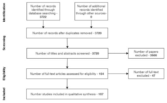 From the 3722 papers returned by the query in Web of Science, the subsequent analysis of the title and abstract resulted in the exclusion of 3566 papers, 54 of them due to being previous reviews. Finally, another 47 papers were discarded due to a lack of compliance with the eligibility criteria. Therefore, 107 articles were finally analysed in our study. Figure 1 shows a flowchart of the query process followed.