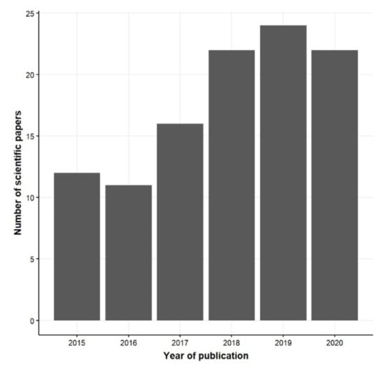 The analysis of the number of papers published by year tended to increase in the 6-year period of study, with a minimum of 11 papers in 2016 and a maximum of 24 in 2019. For 2020, the number of papers was 22, suggesting a sustained rate of papers in the last year (Figure 2).