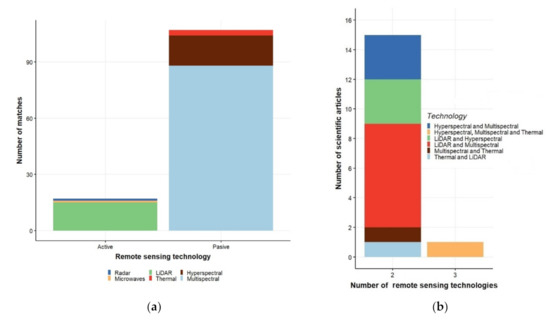 With regard to the technology used, passive sensors were indisputably the most widely used technology, with 85% of the studies using them, whereas active sensors were used alone just 4.7% of the time. The remaining 10.3% combined both types of sensors (Figure 3a). More specifically, multispectral data were used in 88 studies, either alone or in combination with other sensors, while LiDAR was used in 15 studies, hyperspectral in 16, thermal in 3 and radar and microwaves in 1 study each (Figure 3a,b).