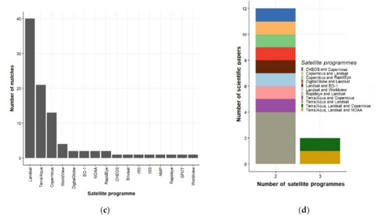 As previously stated, most sensors used were on board satellite platforms. The most frequently used imagery corresponded to the US programmes Landsat (51.3%) and Terra/Aqua (26.9%), followed by the European Copernicus programme (16.7%) (Figure 3c). Following these programmes appeared commercial satellites (Worldview, Digital Globe) with very high spatial resolution capabilities. Finally, 17.9% of the papers used data from different programmes (Figure 3d).
