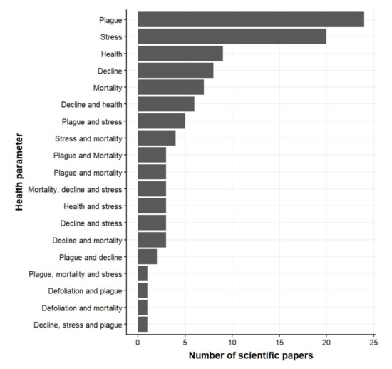 Due to “forest health” being an open concept, we flagged different health parameters analysed in the different studies. Moreover, most of the studies analysed a single health parameter (66.6%), but some analysed forest health based on several parameters, such as the case of Tane [34], who tried to detect conifer mortality under drought and beetle infestation (Figure 4). The use of the different health parameters among the different biomes appears to be generally well distributed, with the exception of the use of stress and plague in tropical and subtropical moist broadleaf forests, temperate coniferous forests and tropical and subtropical dry broadleaf forests. In these biomes, stress and plague parameters were used in the 71.4%, 84.6% and 100% of the cases, respectively.