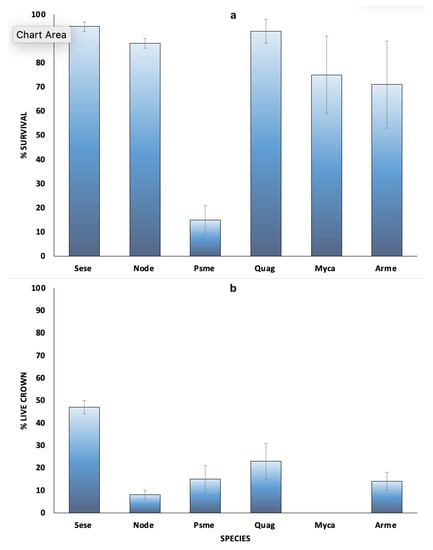 Percent survival (a); and percent trees exhibiting crown retention (b); following a high severity crown fire in Big Basin Redwoods State Park, California. Sese = Sequoia sempervirens (D. Don) Endl.; Node = Notholithocarpus densiflorus (Hook. & Arn.) Manos; Psme = Pseuotsuga menziesii (Mirb.) Franco; Quag = Quercus agrifolia Nee.; Myca = Myrica californica (Cham. & Schltdl.) Wilbur; Arme = Arbutus menziesi Pursh. Error bars indicate standard error.