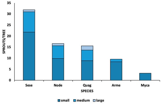 Post fire sprouting by size-class following a high severity crown fire in Big Basin Redwoods State Park, California. Sese = Sequoia sempervirens (D. Don) Endl.; Node = Notholithocarpus densiflorus (Hook. & Arn.) Manos; Psme = Pseuotsuga menziesii (Mirb.) Franco; Quag = Quercus agrifolia Nee.; Myca = Myrica californica (Cham. & Schltdl.) Wilbur; Arme = Arbutus menziesii Pursh. Height classes were defined as small (0.0–0.5 m), medium (>0.5–1 m), and large (>1 m).